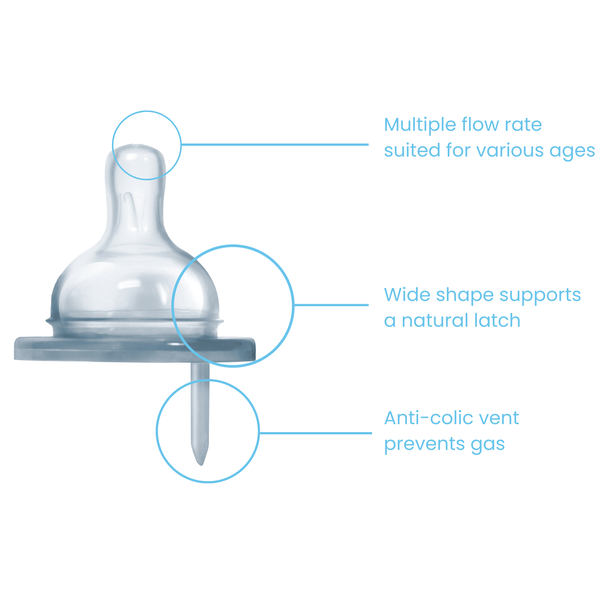 Bruken av flere hull i spissen er designet for å oppnå forskjellige strømningshastigheter for forskjellige aldre (0 m+, 3 m+/, 6 m+/Y-snitt for tykkere væsker eller raskere strømning)